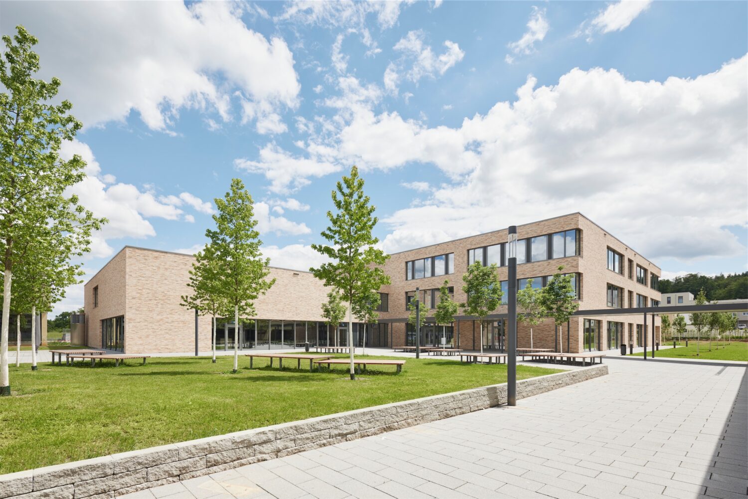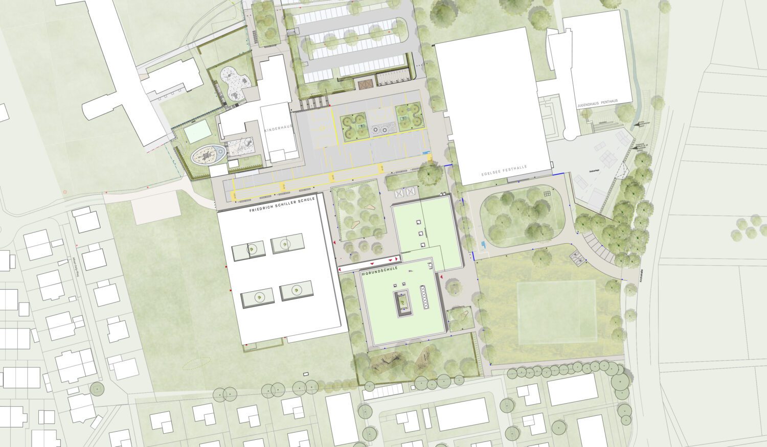 Schule und Mensa werden in einem kompakten und flächensparenden Baukörper untergebracht, der den baulichen Abschluss des Schulgeländes nach Süden bildet. Durch die Setzung des neuen Schulgebäudes entsteht ein großzügig dimensionierter Eingangshof, von dem aus beide Schulen, die Mensa und die übrigen Nutzungsbereiche erschlossen werden und für die Grundschule ein eigener, nach Süden und Osten orientierter Pausenhof.Die unterschiedlichen Nutzungsbereiche Grundschule, Mensa, NW-Bereich und der Gemeinschaftsbereich sind mit eigenen Zugängen jeweils separat vom gemeinsamen Eingangshof aus erschlossen.