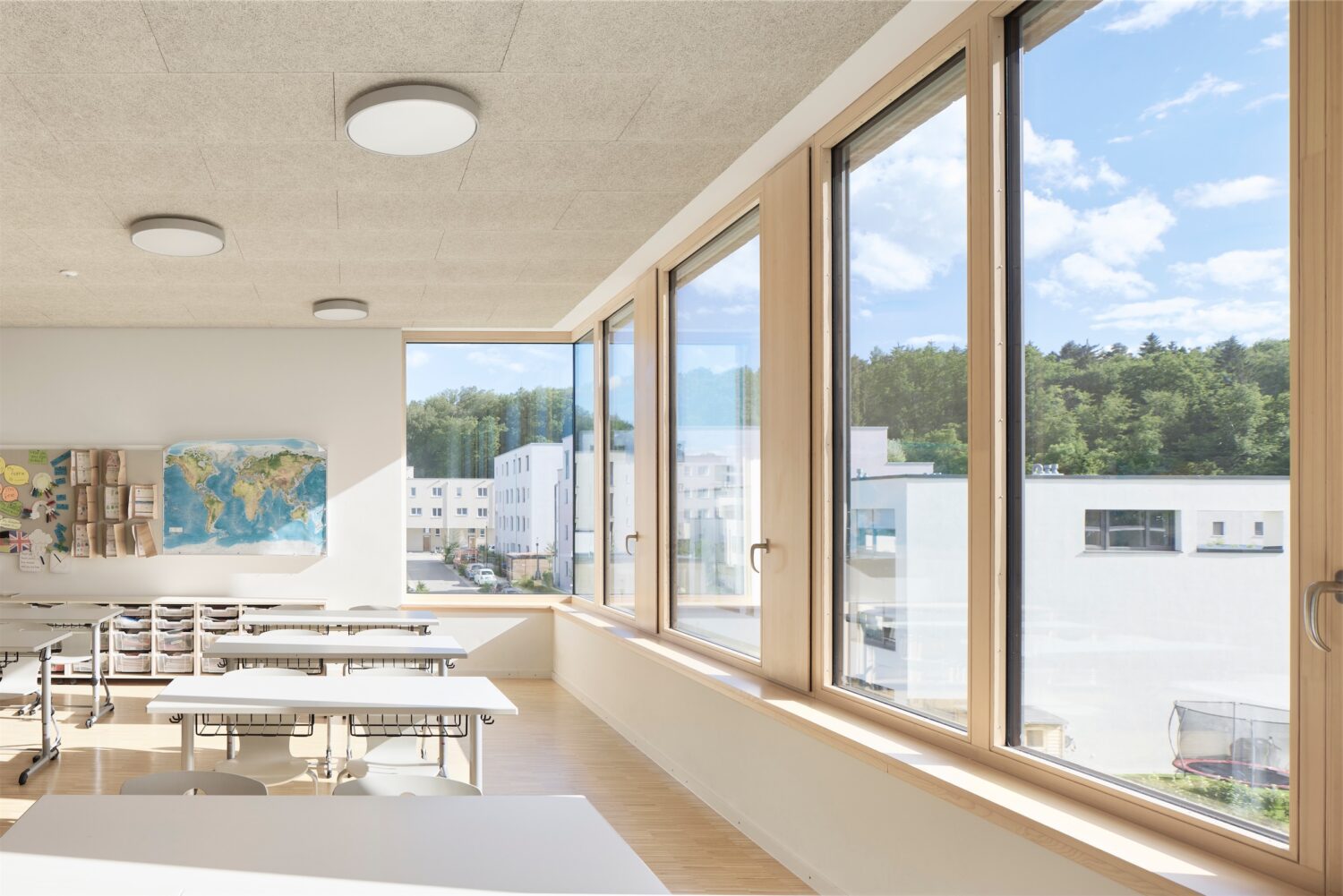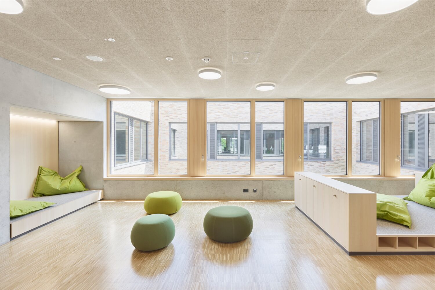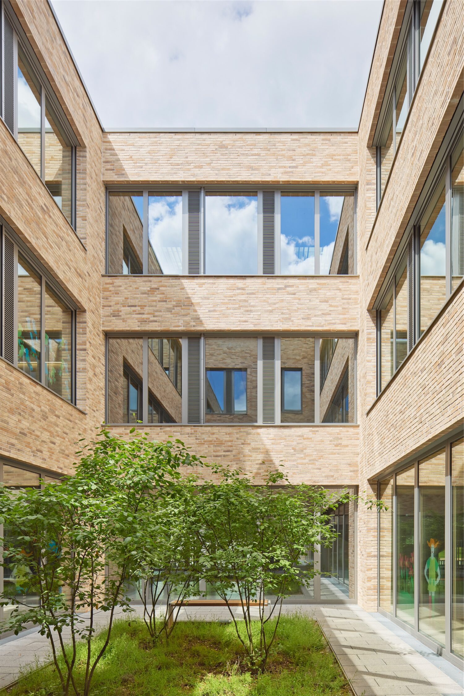 Die Grundschule ist auf drei Geschossen übersichtlich organisiert. Im Erdgeschoss liegen die Verwaltung und der Gemeinschaftsbereich, der Lehr- und Unterrichtsbereich in den beiden Obergeschossen. Jeweils zwei Unterrichtscluster sind um ein begrüntes Atrium gruppiert. Dadurch entsteht eine helle und freundliche Lernatmosphäre. Alle offenen Lernbereiche orientieren sich zum einen nach Innen, zum Atrium, zum andern aber auch nach Außen, zu einer großzügigen Terrasse.