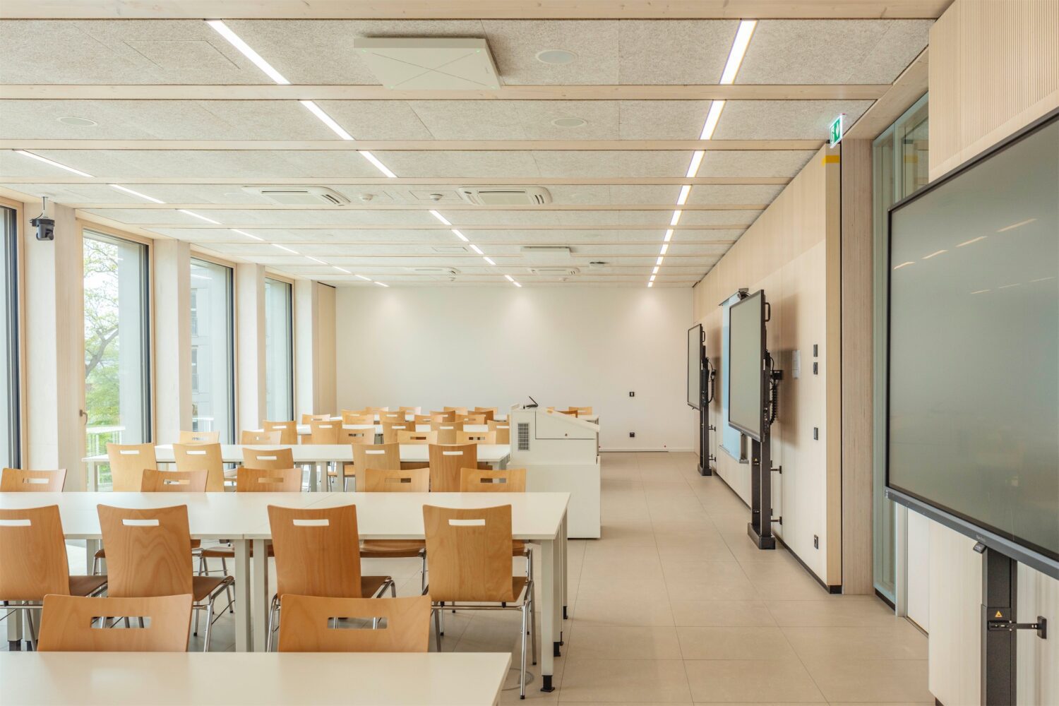 Mensa und Institutsgebäude werden von einem gemeinsamen Vorplatz aus erschlossen und über eine breite Fußwegfläche an den Kreuzungsbereich angebunden. Durch den transparenten Speisesaal besteht eine attraktive Sichtverbindung vom Vorplatz in den Wald. Eine großzügige Freitreppe führt vom Vorplatz Richtung Campus / Wald auf die ein Geschoss tiefer gelegene Waldterrasse mit den Zugängen zu Cafeteria, Hörsaalterrasse und Studentenwohnungen.