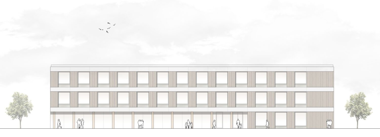 Die Schule markiert nach Süden, zum öffentlichen Campus einen kräftigen baulichen Abschluss und bildet gleichzeitig zur Grünewaldschule ein gleichwertiges bauliches Gegenüber.
